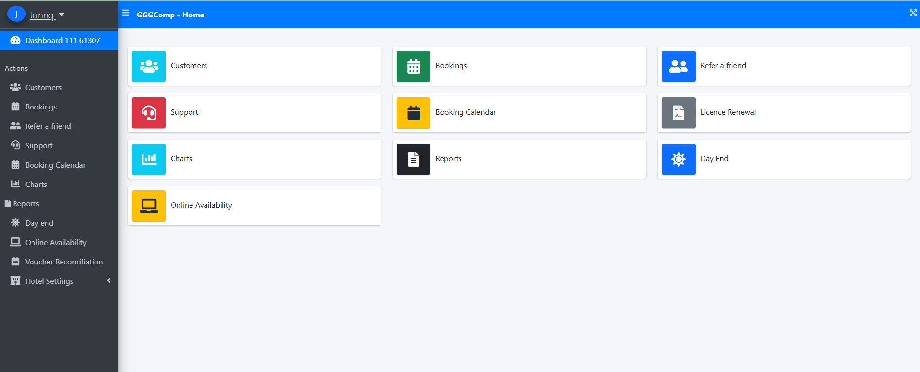 Quick access to customers, bookings, reports, availability, and system settings.