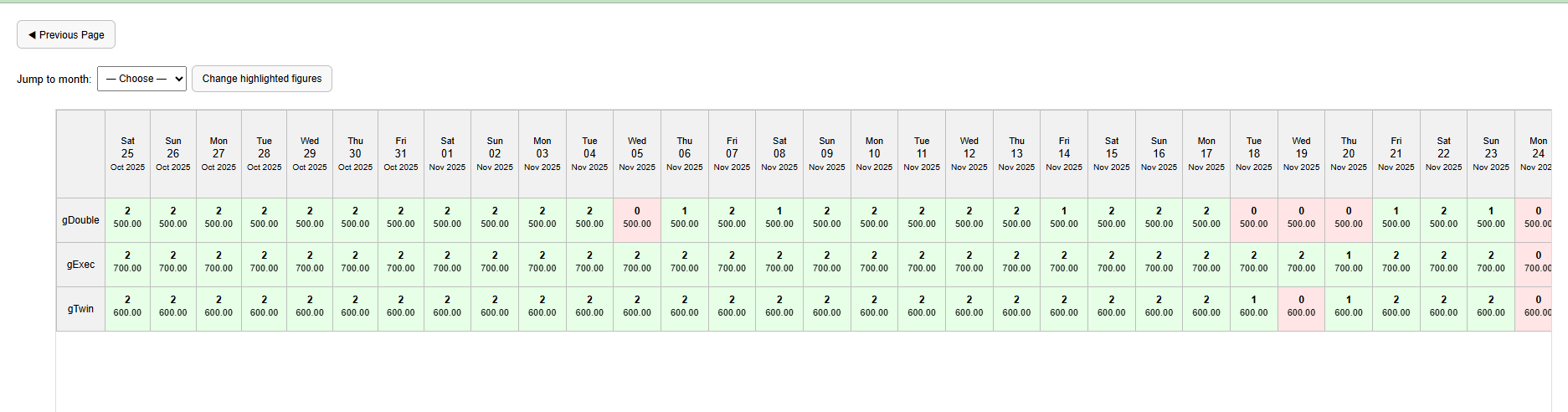 Day-by-day availability view with pricing, occupancy, and quick navigation.
